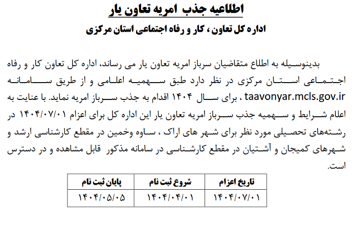 اطلاعیه جذب امریه تعاون یار ۱۱ تیر ۱۴۰۴ | ۱۲:۰۴ کد : ۵۲۷۴۸ اطلاعیه ارسال به دیگران نام شما ایمیل شما ایمیل دریافتکننده ارسال انصراف تعداد بازدید:۱۱۸۴ اطلاعیه جذب امریه تعاون یار