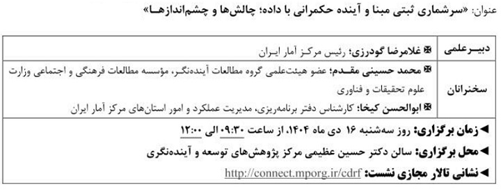 نشست علمی سرشماری ثبتی مبنا آینده حکمرانی با داده ۱۴ دی ۱۴۰۴ | ۱۰:۲۱ کد : ۵۷۴۱۸ اطلاعیه ارسال به دیگران نام شما ایمیل شما ایمیل دریافتکننده ارسال انصراف تعداد بازدید:۴۵۳ دویست وسی وهفتمین نشست علمی - تخصصی با عنوان سرشماری ثبتی مبنا آینده حکمرانی با داده، چالش ها وچشم اندازها