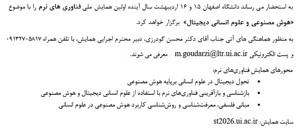 اطلاعیه دانشگاه علوم پزشکی اصفهان در خصوص درخواست حمایت معنوی از همایش هوش مصنوعی و علوم انسانی دیجیتال به شرح ذیل می باشد.