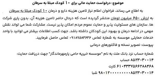 درخواست حمایت مالی، برای ۱۰ کودک مبتلا به سرطان ۰۷ بهمن ۱۴۰۴ | ۱۱:۳۳ کد : ۵۷۷۳۲ اطلاعیه ارسال به دیگران نام شما ایمیل شما ایمیل دریافتکننده ارسال انصراف تعداد بازدید:۸۵ موسسه خیریه حامی یار، درخواست حمایت مالی، برای ۱۰ کودک مبتلا به سرطان را دارد.